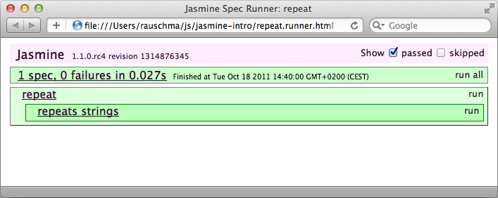 repeat.spec.js contains the tests and can be run on Node.js, repeat.runner.html loads and executes repeat.spec.js in a web browser.