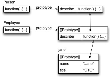 jane is the first member in a chain of prototypes. Its direct prototype is Employee.prototype whose prototype is Person.prototype. Super-references (including super-calls) are a feature of ECMAScript 6 which allows one to write describe() much more succinctly: